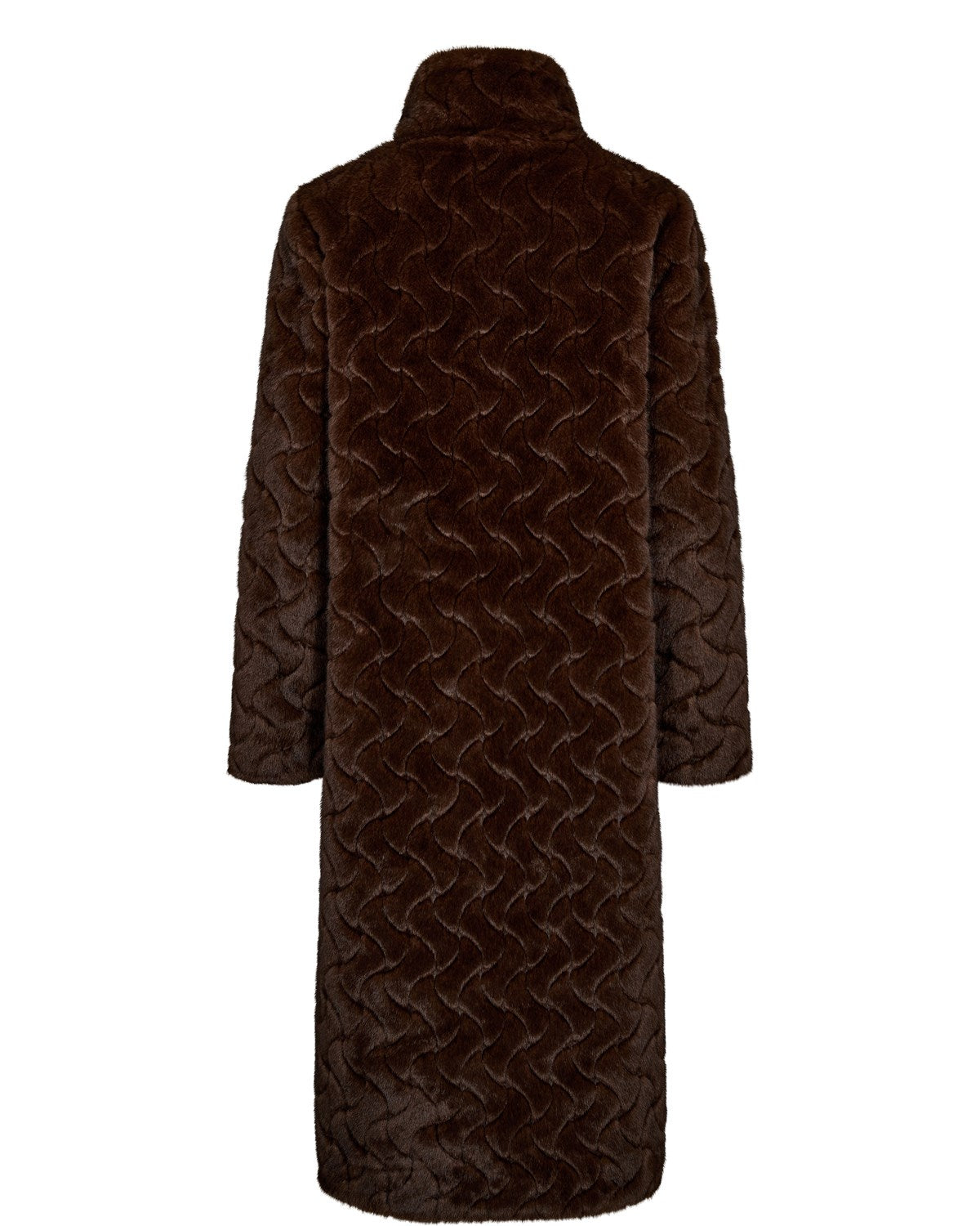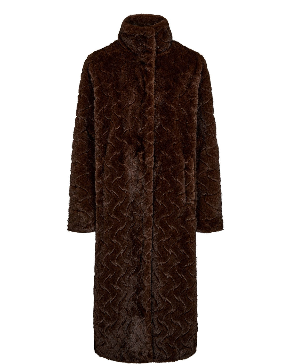Long, soft faux fur coat in brown with an elegant pattern. The coat has a loose fit, slanted pockets, and a luxurious look. Fully lined to keep you warm and stylish throughout the season.
